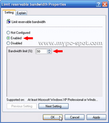 4.Pada jendela Limit Reservable Bandwidth tandai option Enable dan set Bandwidth limit menjadi 50 % atau nilai yang Anda inginkan. Semakin besar nilai yang Anda set maka semakin kecil bandwidth yang bisa digunakan komputer tersebut.